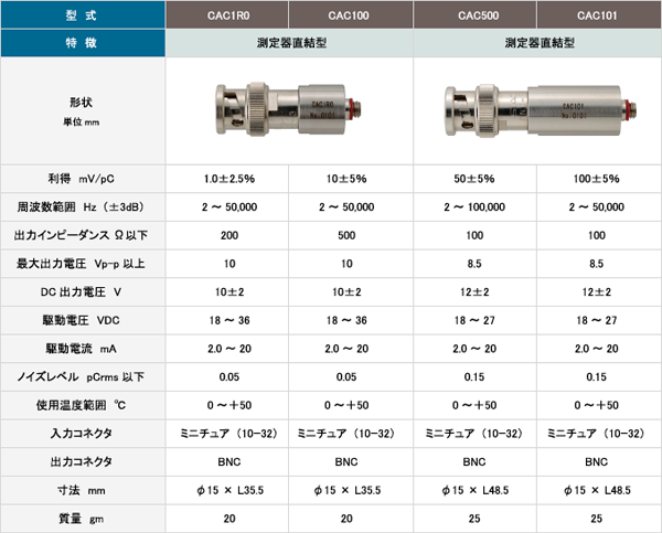 - アンプ内蔵圧電型加速度センサやマイクロホンの他、電荷型加速度センサも使用できます。